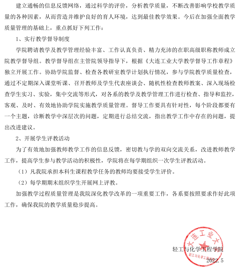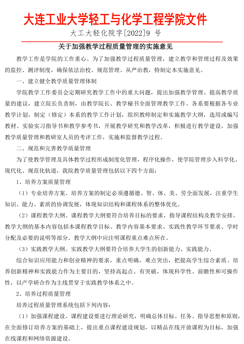 英国365公司官网关于加强教学过程质量管理的实施意见(大工大轻化院字[2022]9号)
