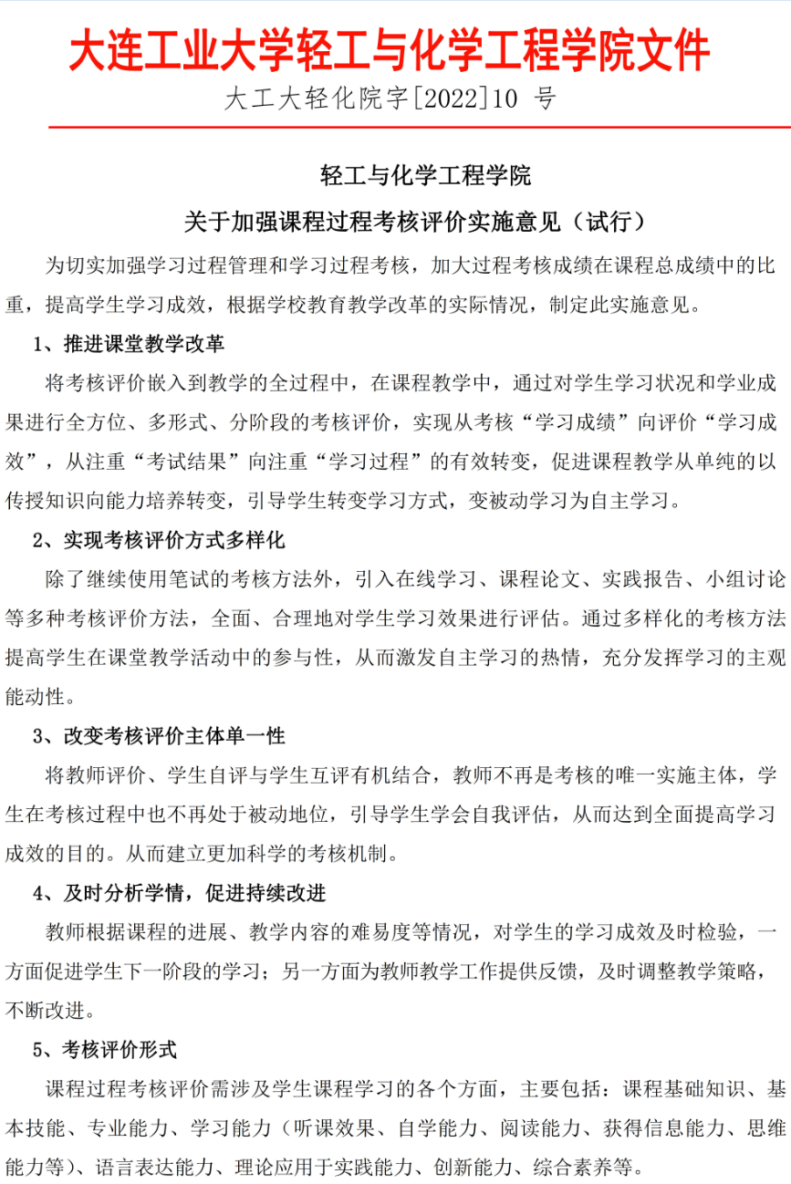 英国365公司官网关于加强课程过程考核评价实施意见(试行)(大工大轻化院字[2022]10号)